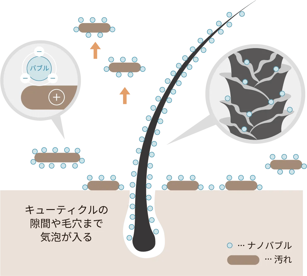 ナノバブルとは、目に見えない小さな気泡のことです。 通常の水では届かない毛穴やキューティクルの隙間に入り込み、汚れや皮脂を浮かせてスッキリ除去します。 水と空気だけで洗うため、髪や頭皮にやさしいのが特長です。